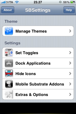 Uno dei tool che piu’ ho apprezzato tra quelli presenti nel parco applicazioni di Cydia e’ SBSettings, un programma che gira in background e permette di avere sempre a disposizione un menu’ dal quale potremo in pochi istanti modificare le impostazioni piu’ importanti del nostro cellulare. Ad esempio potremo attivare e disattivare i vari dispositivi relativi alla connettivita’ (WI-FI, Bluetooth, GPS, la connettivita’ 3G e l’EDGE ), variare la luminosita’ del display e rendere disponibile o meno l’SSH dall’esterno.